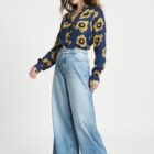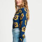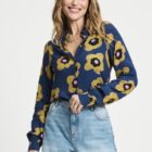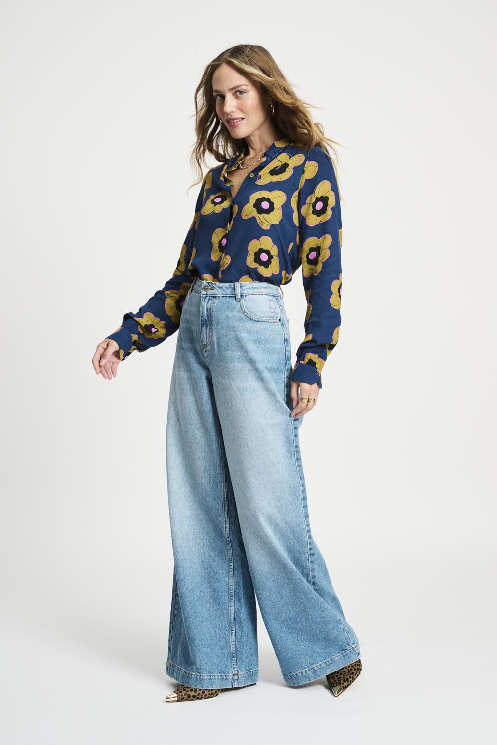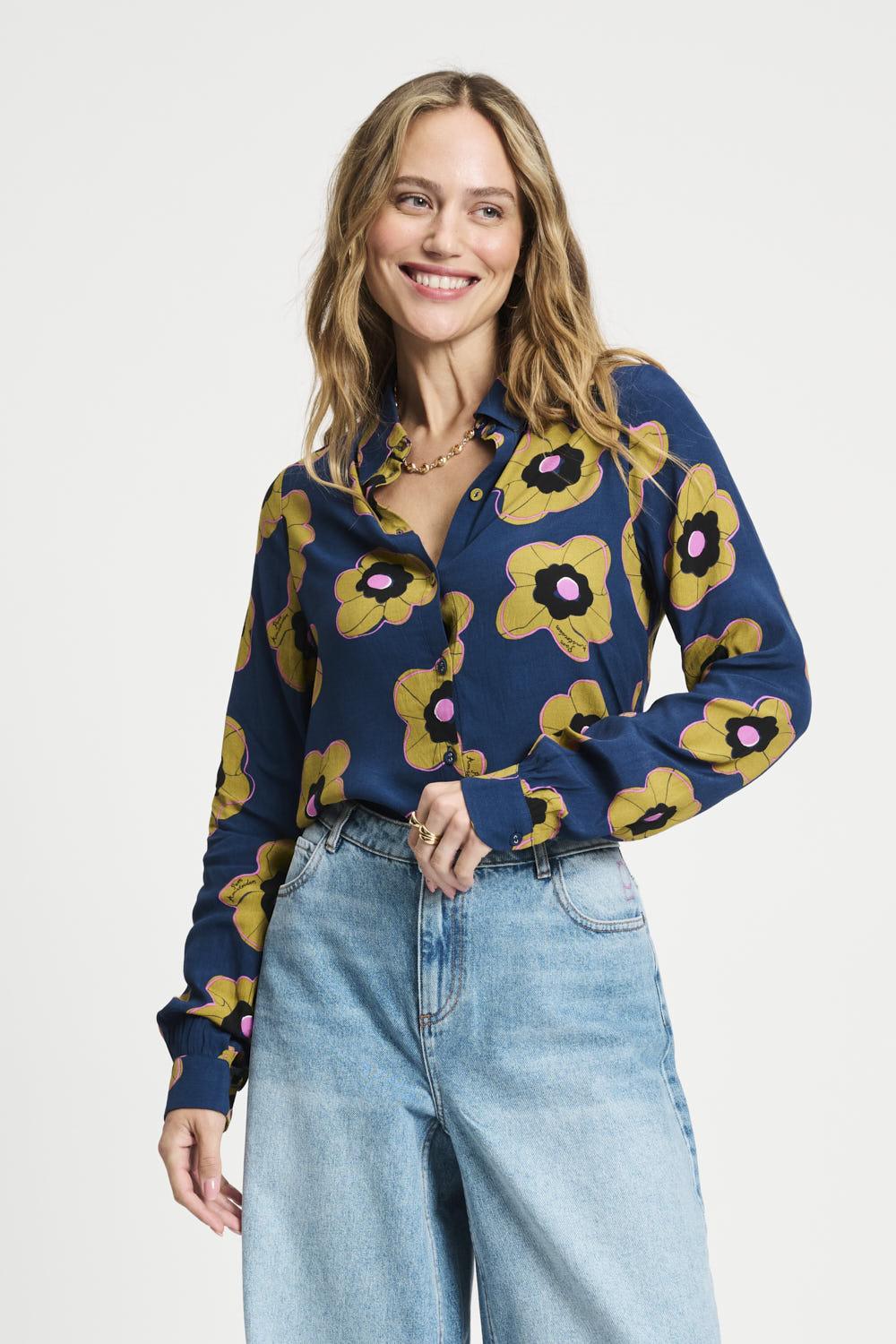 De blouse komt in een donkerblauwe kleur, heeft een grafische bloemenprint, een klassieke kraag en is gemaakt van een soepele stof.