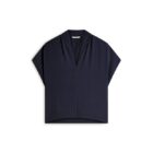 De top komt in een donkerblauwe kleur, heeft een V-hals, subtiele kapmouwtjes, een losvallende pasvorm en krijgt een sierlijke uitstraling door de glanzende stof.