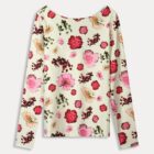 De top komt in een ivoorwitte kleur, heeft een gekleurde bloemenprint, lange mouwen en kan aan beide kanten worden gedragen. Ga voor de boothals aan de voorkant of voor de laag uitgesneden hals achter.